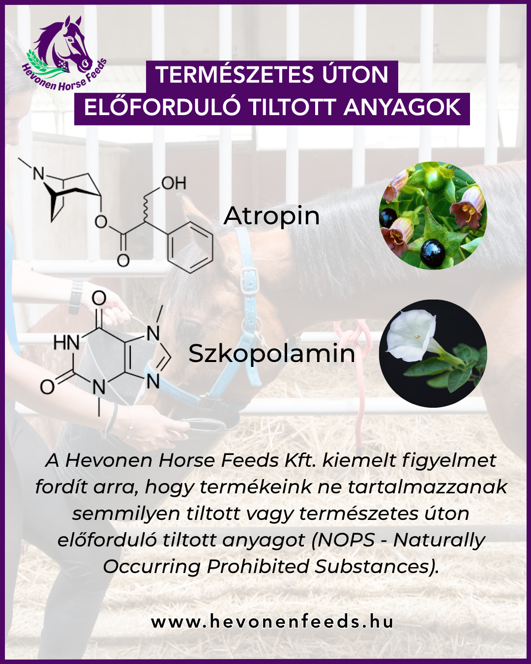 A Hevonen Horse Feeds Kft. kiemelt figyelmet fordít arra, hogy termékeink ne tartalmazzanak semmilyen tiltott vagy természetes úton előforduló tiltott anyagot (NOPS - Naturally Occurring Prohibited Substances). Ezek az anyagok - például a koffein, teobromin, morfin, atropin, vagy szkopolamin - bizonyos növényekben (például kakaóban, mákban, nadragulyában vagy gyomfajokban) természetes módon előfordulhatnak, és már kis mennyiségben is súlyos egészségkárosodást vagy pozitív doppingtesztet okozhatnak a lovaknál.