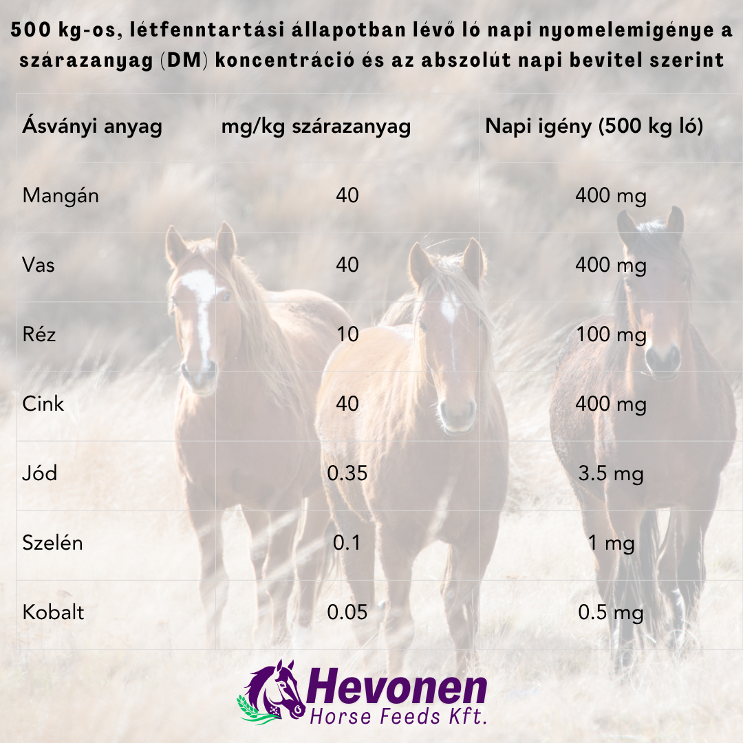 Az alábbi táblázat összegzi a felnőtt, 500 kg-os, fenntartási állapotban lévő ló napi nyomelemigényét a szárazanyag (DM) koncentráció és az abszolút napi bevitel szerint.